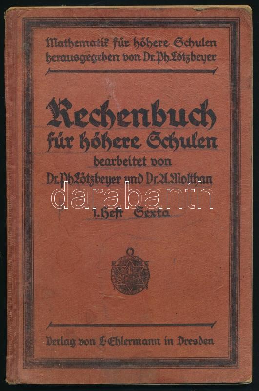 Dr. Ph. Lötzbeyer, Fr. Heinze: Rechenbuch für höhere Schulen. 1. Heft. Mathematik für höhere Schulen. Unterstufe I. Dresden, 1928, Verlag von L. Ehlermann, 106 p. Német nyelven. Kiadói félvászon-kötés, kissé gyűrött, foltos borítóval, helyenként kissé foltos lapokkal.