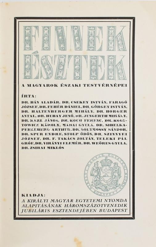 Finnek, észtek. A magyarok északi testvérnépei. Írták: Dr. Kogutovicz Károly, Dr. Szinnyei József, Teleki Pál, Dr. Zsirai Miklós és mások. Bp.,1928, M. Kir. Egyetemi Nyomda.Fekete-fehér képanyaggal illusztrált. Kiadói kartonált papírkötés, kissé kopott borítóval, egyébként jó állapotban
