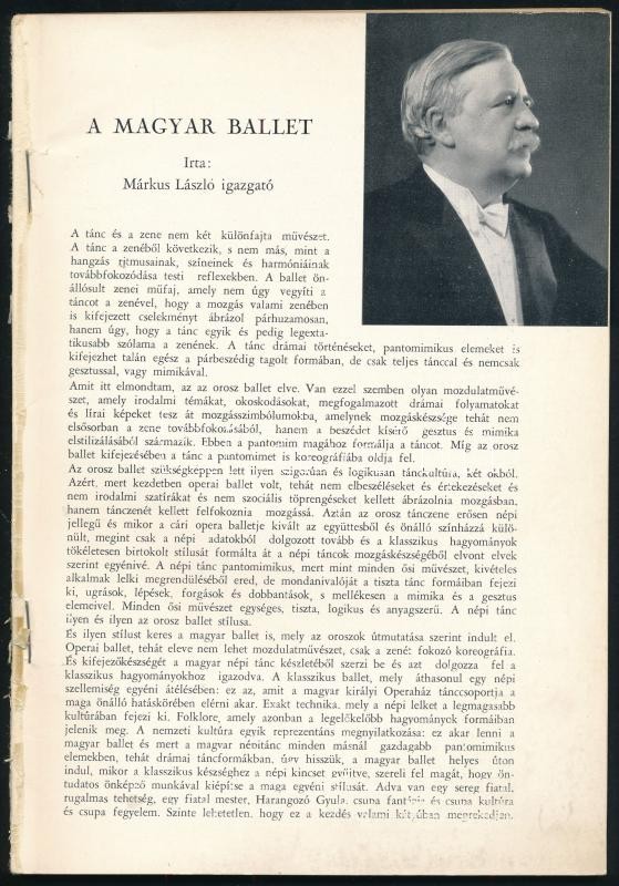 Magyar balettek. írta Márkus László igazgató. színpadtervekkel, mellékletekkel, stb illusztrált kiadói papírborítóval, könyvtest elvált. Olasz és német nyelvel. Budapest, d.n. Officina.