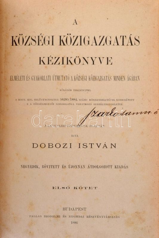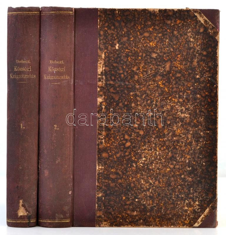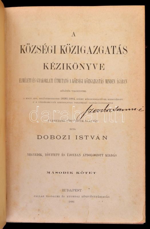 Leírás: Dobozi István: A községi közigazgatás kézikönyve. I.-II. Elméleti és gyakorlati útmutató. Bp, 1886. Pallas. Kopottas félvászon kötésben.