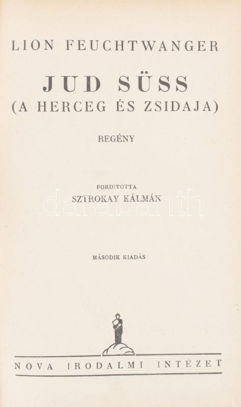 Feuchtwanger, Lion: Jud Süss (A herceg és zsidaja). Bp., 1934, Nova. Kiadói egészvászon kötés, belül a gerincnél kissé elvált, egyébként jó állapotban.