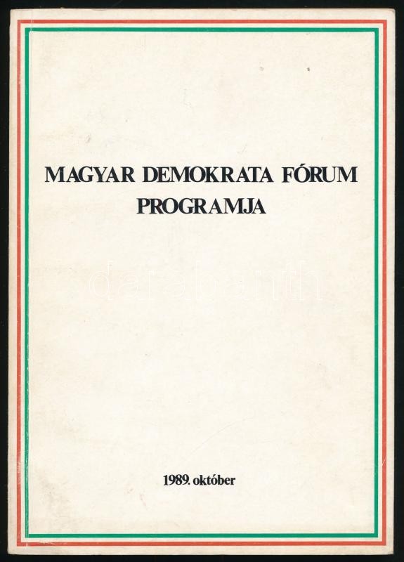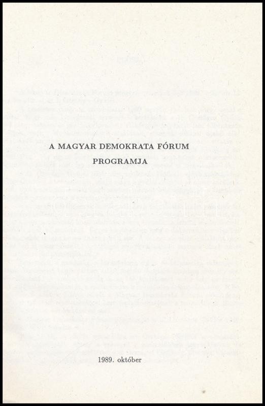 A Magyar Demokrata Fórum programja. 1989. október. Szerk.: Kulin Ferenc. Bp.,1989, Font Kft. (Zeneműnyomda), 163+1 p. Kiadói papírkötés, a borító kissé kopott, foltos.