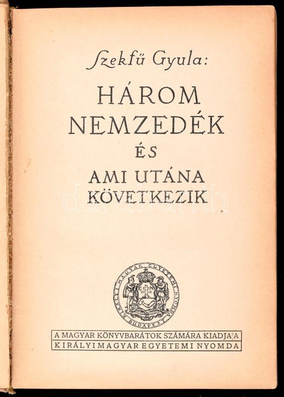 Szekfű Gyula: Három nemzedék és ami utána következik. Bp., (1935), Kir. M. Egyetemi Ny., 514 p. Kiadói aranyozott egészvászon-kötés, kissé foltos, kopott borítóval.