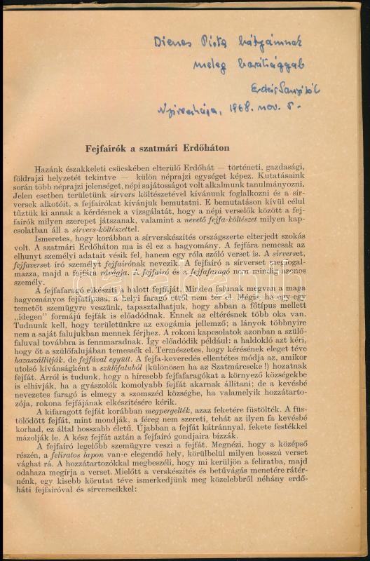 A szerzÅ‘, Erdész Sándor (1929-2006) néprajzos, nyÃrségi mesegyűjtÅ‘, múzeumigazgató által Dienes István (1929-1995) régész, muzeológus részére dedikált példány.