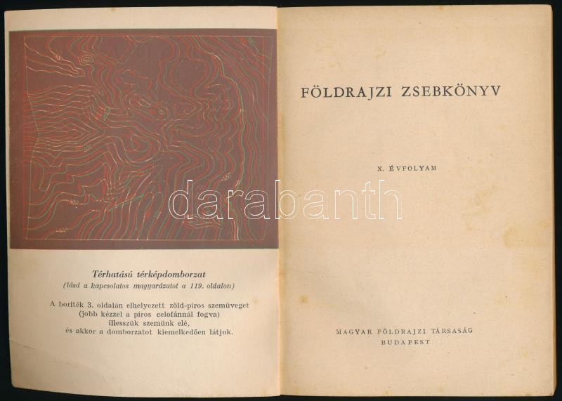 Földrajzi zsebkönyv. X. köt. Szerk.: Láng Sándor, Miklós Gyula, Tóth Aurél. Bp.,(1958.),Magyar Földrajzi Társaság. Az elülső belsején térhatású térképpel, valamint hátul hozzá tartózó 3D szemüveggel. Kiadói papírkötés, a gerincen kis szakadással.