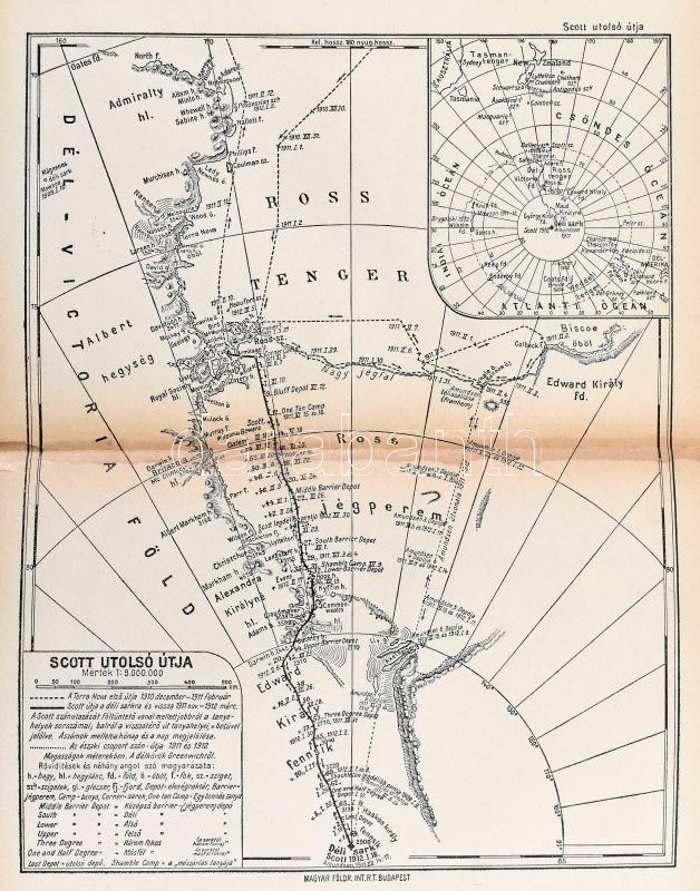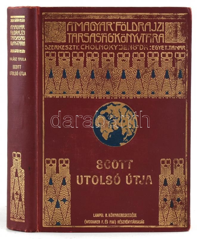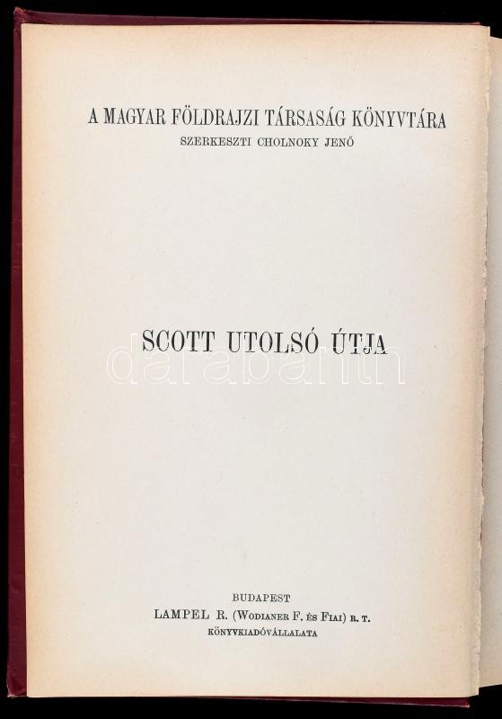 [Scott, Robert Falcon (1868-1912)] Scott utolsó útja. Scott naplója és útitársainak feljegyzései. FordÃtotta Halász Gyula. Negyven képpel és egy térképpel. Magyar Földrajzi Társaság Könyvtára. [Bp.,1923, Lampel R. (Wodianer F. és Fiai) Rt.], 332 p. + 15 (fekete-fehér képtáblák) t. + 1 (kétoldalas térkép) t. Kiadói dúsan aranyozott egészvászon sorozatkötésben, kopott borÃtóval, hiányzó cÃmlappal, kijáró cÃmképpel.