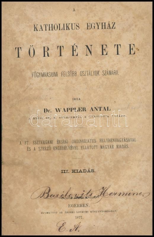 Wappler Antal: A Katholikus Egyház története főgymnasiumi felsőbb osztályok számára. Eger, 1877., Érseki Lyceum, VIII+208 p. Átkötött félvászon-kötés, kopott borítóval, kissé foltos lapokkal, aláhúzásokkal, bejelölésekkel.