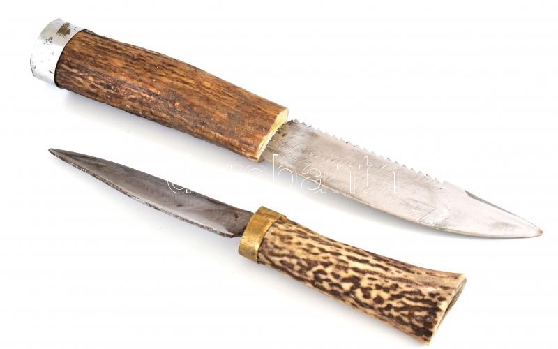 Leírás: 2 db vadász kés, agancs nyéllel, kopott, jelzés nélkül, h:17-23cm