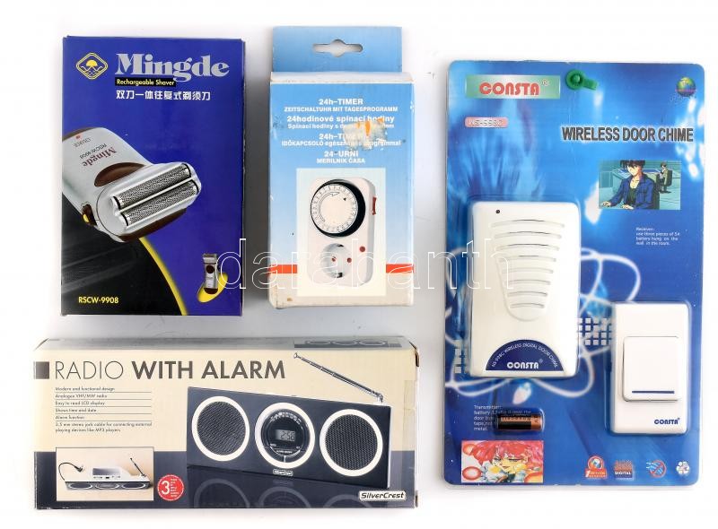 Leírás: 4 db elektronikai cikk: ébresztős rádió + vezeték nélküli, elemes ajtócsengő + borotva készülék, töltőkábellel + időkapcsoló, időzítő konnektor, eredeti dobozukban, nem kipróbáltak