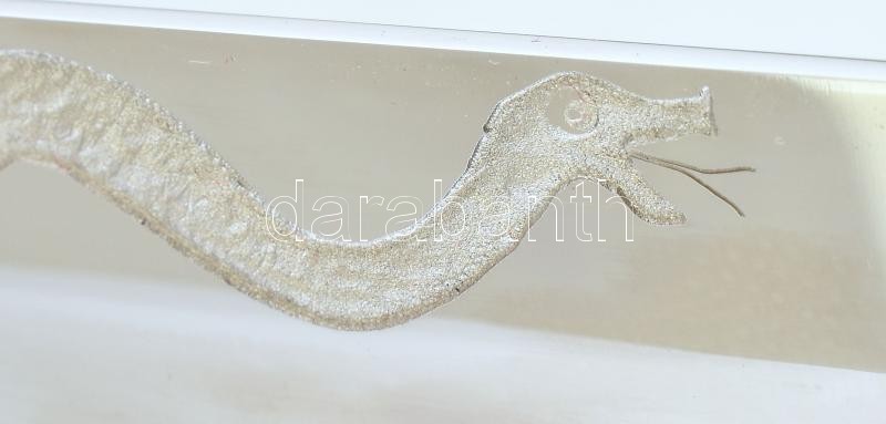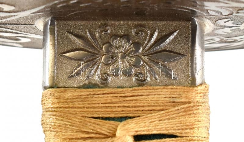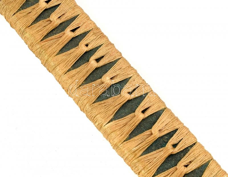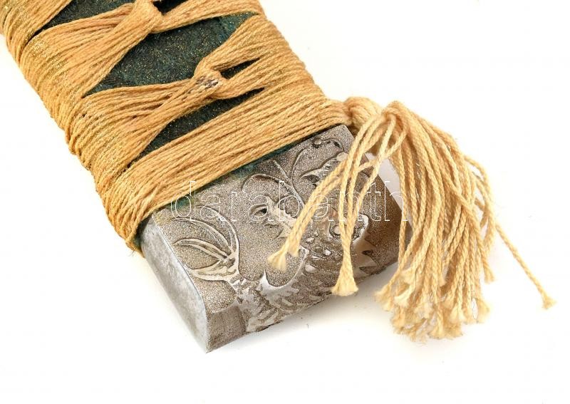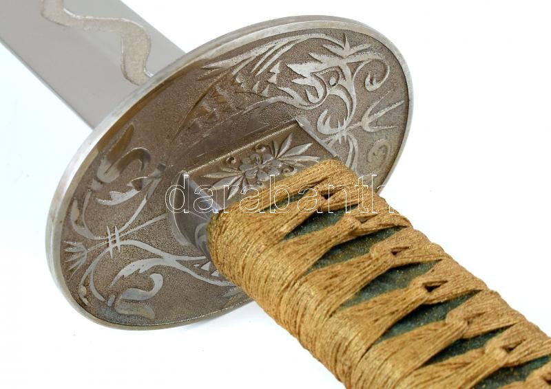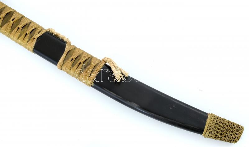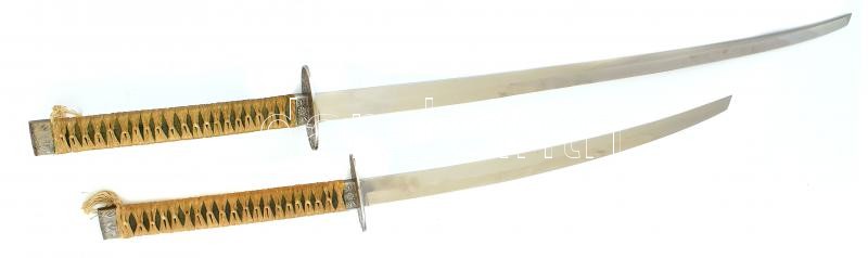 Leírás: Japán katana és wakizasi szett (szamurájkard) tartóval. Vésett kígyó jelzéssel, fa hüvellyel. Szép állapotú. 102 cm, 76 cm