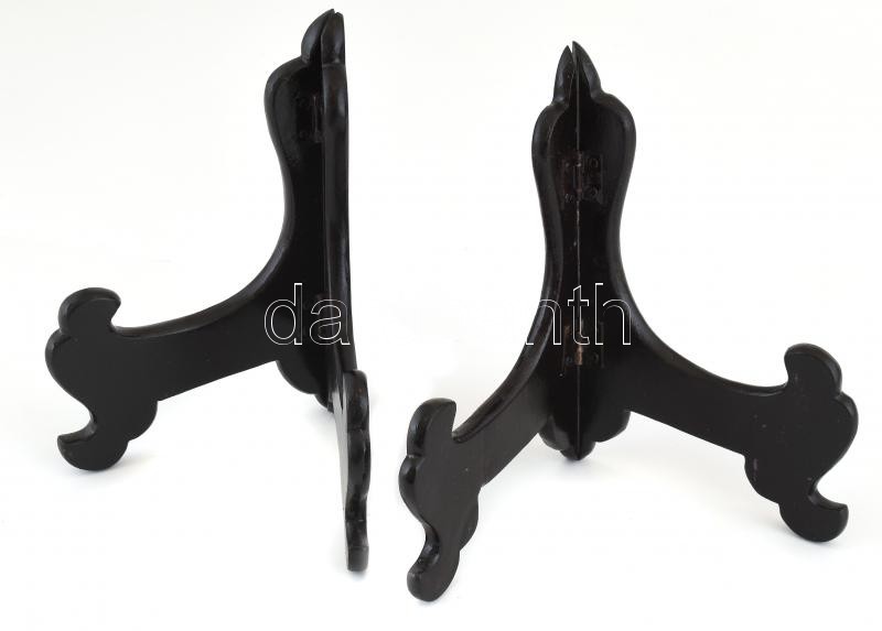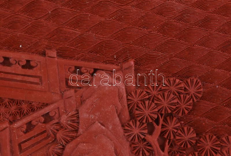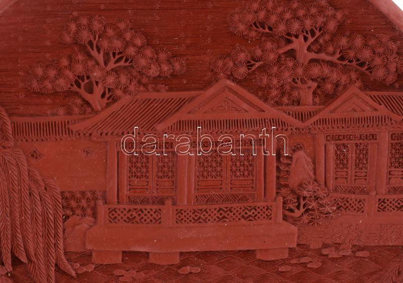 Leírás: Kínai faragott lakk dísztál, tartóval, apró kopásokkal, d:21cm