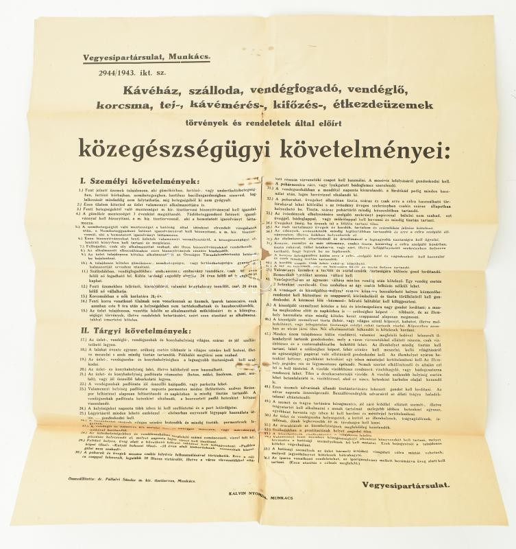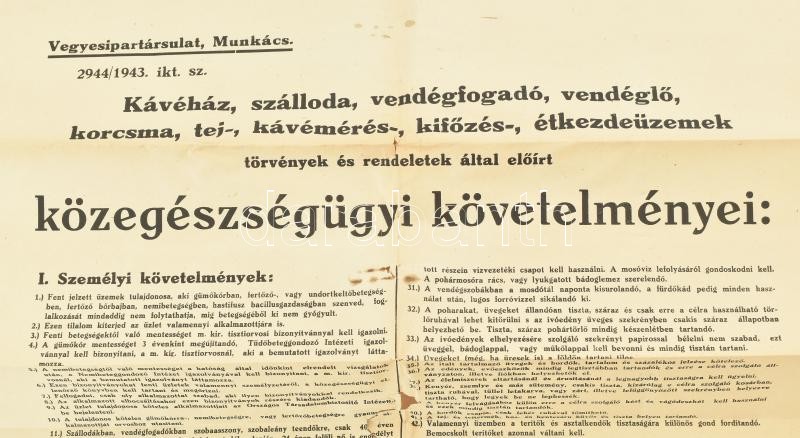 1943 Munkács, Vegyipartársulat hirdetménye: kávéház, szálloda, vendégfogadó, vendéglő, korcsma, tej-, kávémérés-, kifőzés-, étkezdeüzemek törvények és rendeletek által előírt közegészségügyi előzményei, szakadásokkal, 49×42 cm