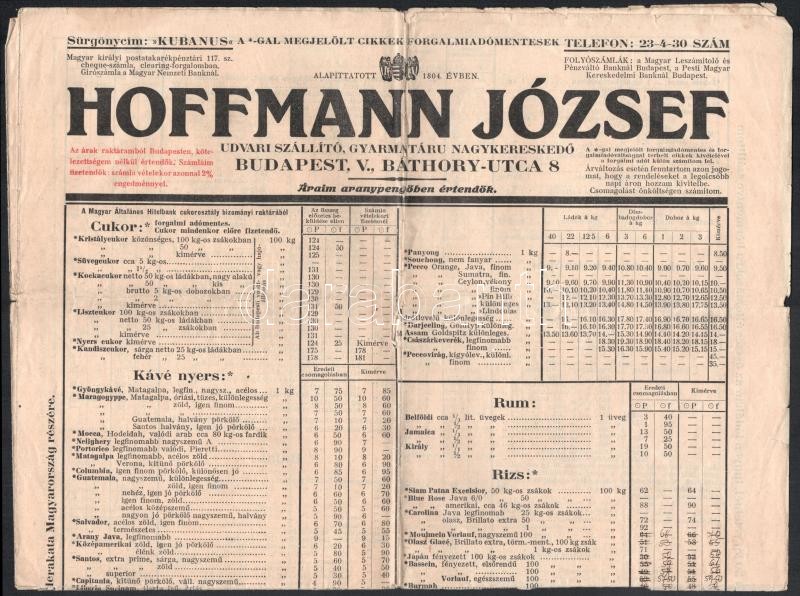 cca 1930 Hoffmann József Udvari Szállító, Gyarmatárú Nagykereskedő árl... https://www.darabanth.com/hu/414-Gyorsarveres/414.0/Mutargy-papirregiseg-egyeb/Nyomtatvanyok~1000005/cca-1930-Hoffmann-Jozsef-Udvari-Szallito-Gyarmataru-Nagykereskedo-arlistaja-viseltes-all~II2595325