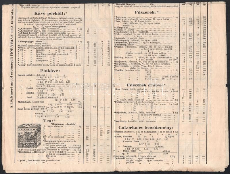 Leírás: cca 1930 Hoffmann József Udvari Szállító, Gyarmatárú Nagykereskedő árlistája, viseltes állapotban