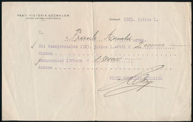 1923 Bp., a Pesti Victoria Gőzmalom fejléces számlája, középen hajtott https://www.darabanth.com/hu/414-Gyorsarveres/414.0/Mutargy-papirregiseg-egyeb/Okmanyok~500018/1923-Bp-a-Pesti-Victoria-Gozmalom-fejleces-szamlaja-kozepen-hajtott~II2588020