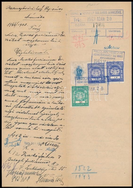 Leírás: 1943 Hódmezővásárhely, árvaszéki jegyzőkönyv, 3 db, illetékbélyeggel