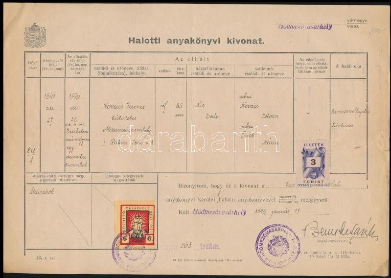 Leírás: 1949 Hódmezővásárhely, halotti anyakönyvi kivonat anyakönyvi illetékbélyeggel vízjeles papíron