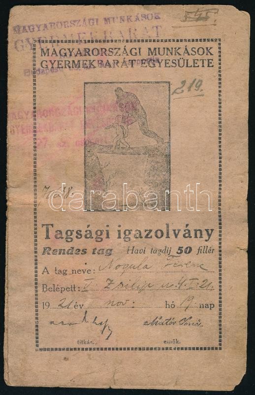 1921 Magyarországi Munkások Gyermekbarát Egyesülete tagsági igazolvány tagsági bélyegekkel. Sérült.