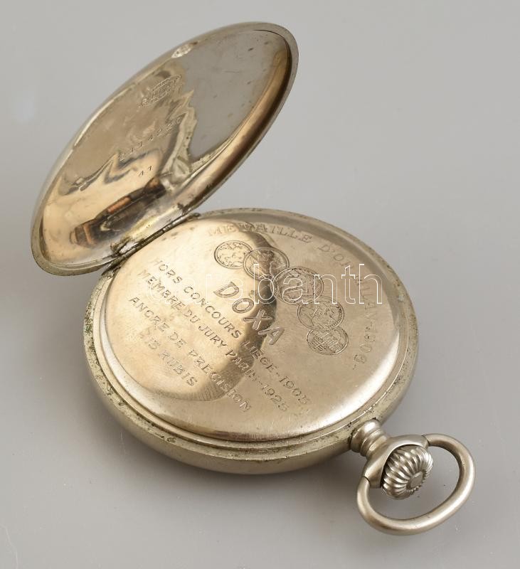 Leírás: Doxa ezüstözött fém tokos zsebóra, hibátlan számlappal, szép állapotban, működik, 1920 körül d: 50 mm