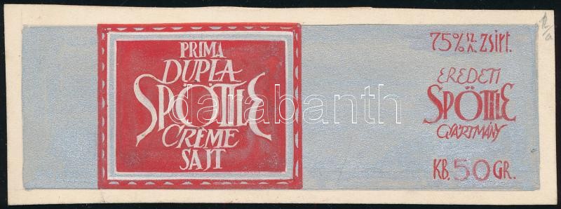 Leírás: Prima dupla Spöttle créme sajt, eredeti Spöttle gyártmány. Reklám v. csomagolás terv. Tempera, papír. 1940 körül. Jelzés nélkül, 5×15 cm