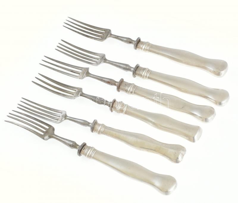 Leírás: Ezüst (Ag) nyelű villa, 6db, jelzett, kopott, h:18cm, bruttó: 238 g