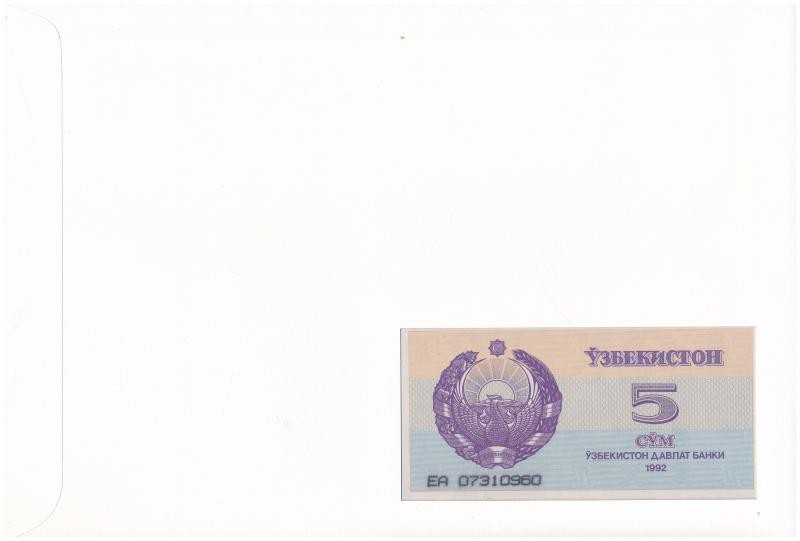 Uzbekistan 1992. 5 Sum in envelope with stamp and cancellation C:UNC