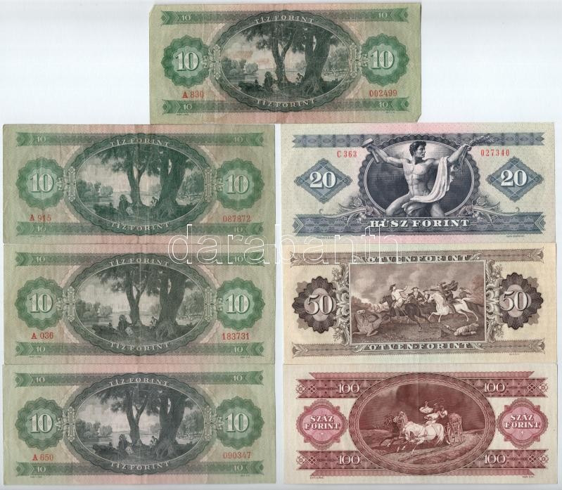 1969. 10Ft (4x) + 1980. 20Ft + 1989. 50Ft + 1992. 100Ft T:II-III https://www.darabanth.com/hu/414-Gyorsarveres/414.0/Numizmatika/Magyar-bankjegyek~2000007/1969-10Ft-4x-plus-1980-20Ft-plus-1989-50Ft-plus-1992-100Ft-TII-III~II2593722