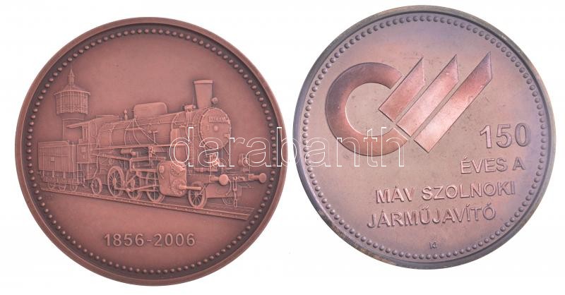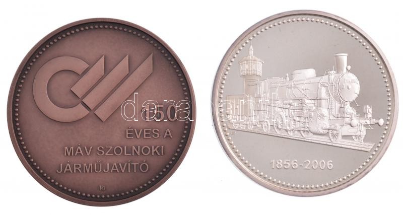 Kósa István (1953-) 2006. "150 éves a MÁV szolnoki járműjavító / 1856-2006" peremén jelzett Ag és Br emlékérem pár, mindkettő dísztokban (124,68g/0.999/65mm) T:1,PP patina