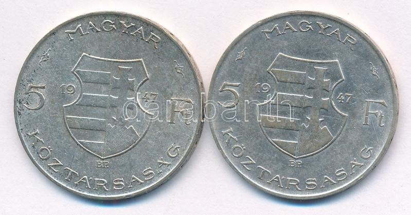 Leírás: 1947. 5Ft Ag "Kossuth" (2x) T:2 patina, kis ph