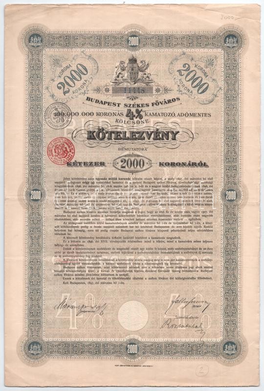 Leírás: Budapest 1897. "Budapest Székes Főváros" 4%-al kamatozó kölcsön kötelezvénye 2000K-ról, szárazpecséttel, 1db szelvénnyel T:III