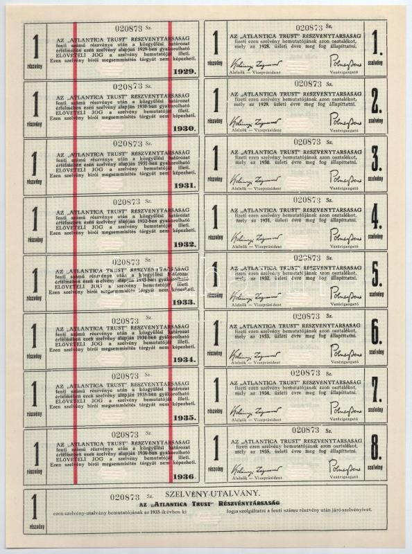 Leírás: Budapest 1928. "Atlantica Trust Részvénytársaság" részvénye 20P-ről, magyar-német nyelven, szelvényekkel, szárazpecséttel T:I-
