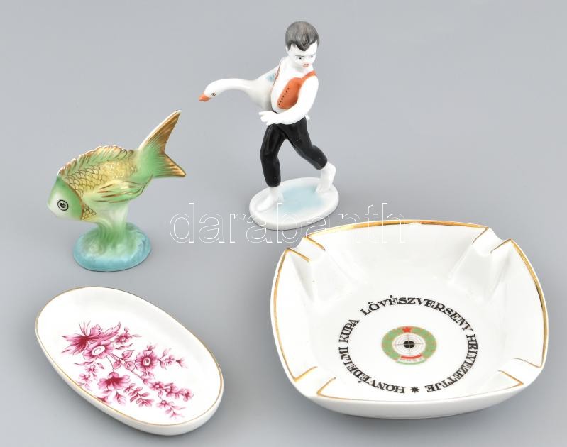 Leírás: Hollóházi porcelán tálka és figura, 4 db, jelzett, kopásnyomokkal