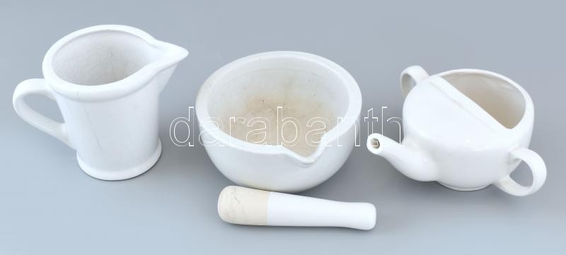 Leírás: Jelzetlen mérőkanna, repedt, jelzetlen beteg itató, Zyolnay patikaedény, apró lepattanásokkal, vegyes méretben.