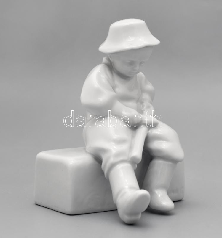 Leírás: Zsolnay botfaragó porcelán fiúcska, fehér mázas, jelzett, (tervezte: Sinkó András), egészen apró mázhibával, 14,5x11,5x10,5 cm