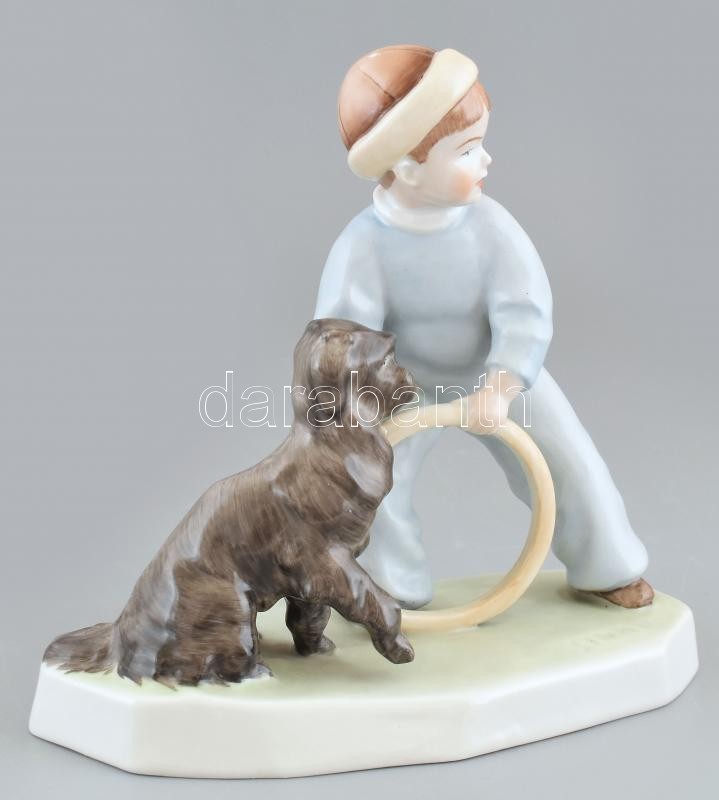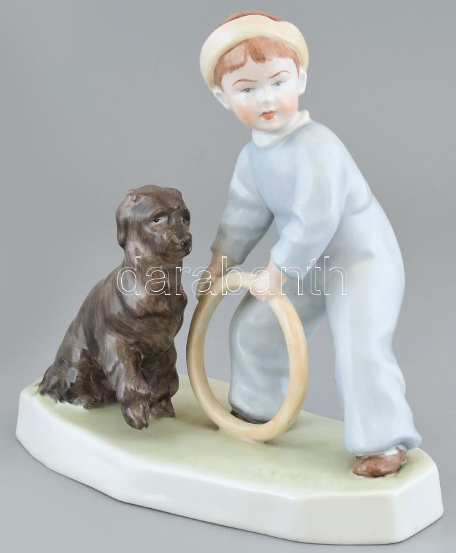 Leírás: Zsolnay karikázó kisfiú a kutyával, kézzel festett, hibátlan, jelzett (Sinkó), h: 19 cm, m:18 cm
