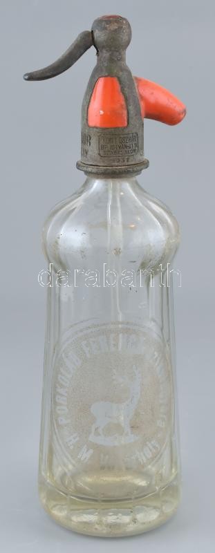 Leírás: Régi szódásüveg, Porkoláb Ferencz Szikvízgyára Hódmezővásárhely, 1937 körül. Kopott, kisebb csorbákkal, m: 30 cm