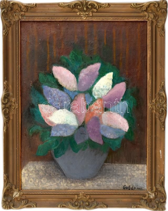 Leírás: Gubár (?) jelzéssel: Csendélet. Olaj, vászon. Dekoratív, sérült fa keretben. 40x30 cm