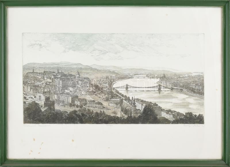 Csurgói Máté Lajos (1931-2001): Budapesti panoráma. Rézkarc, papír, jelzett, számozott (71/100). Lap széle kissé foltos. Üvegezett fakeretben. 25×50 cm