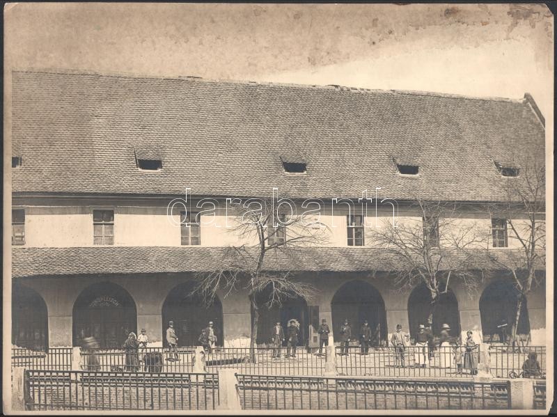 Leírás: cca 1930 Nagyszeben nagy méretű fotó oszlopsoros ház Hentes boltjával. Felül sérült 40x30 cm