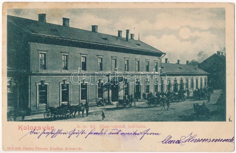 1900 Kolozsvár, Cluj; A Magy. Kir. Államvasutak indóháza, MÁV vasútáll... https://www.darabanth.com/hu/415-Gyorsarveres/415.0/Kepeslapok/Erdely~1000006/1900-Kolozsvar-Cluj-A-Magy-Kir-Allamvasutak-indohaza-MAV-vasutallomas-Dunky-fiverek-~II2604021