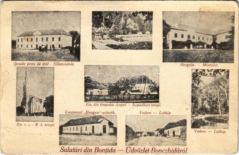 1935 Bonchida, Bontida; Scoala prim. de stat, Biserica r. c., Bis. din timpului Arpad, Hergelie, Vedere, Conzumul "Hangya" / Állami elemi iskola, Római katolikus templom, Árpád-kori templom, Méntelep, látkép, utca, Hangya Szövetkezet üzlete / elementary school, Catholic church, stud farm, general view, street view, cooperative shop (fa)