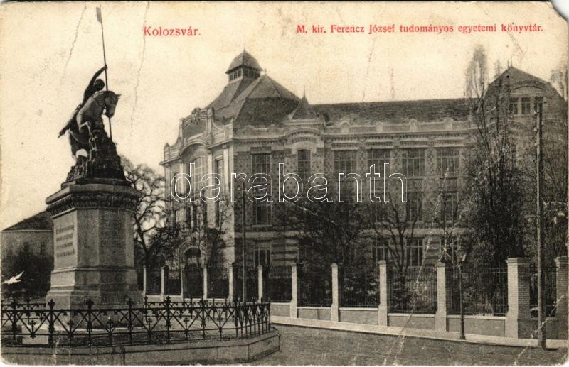 Kolozsvár, Cluj; M. kir. Ferenc József tudományos egyetemi könyvtár. Schuster Emil kiadása. Hátoldalon a Magyar Sokszorosító Műipar R.T. reklámja / university library (b)