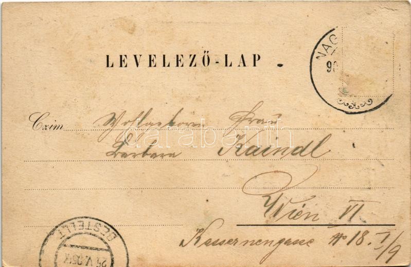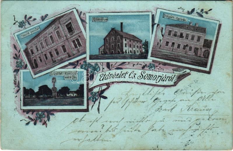 1905 Somorja, Csallóköz-Somorja, Somorin, Samorín; Takarékpénztár, Gőzmalom, Polgári tanoda, Erzsébet királyné (Sissi) emlékfái. Goldstein kiadása / savings bank, steam mill, school, Empress Elisabeth of Austria monument. Art Nouveau, floral, litho (apró lyuk / tiny pinhole)