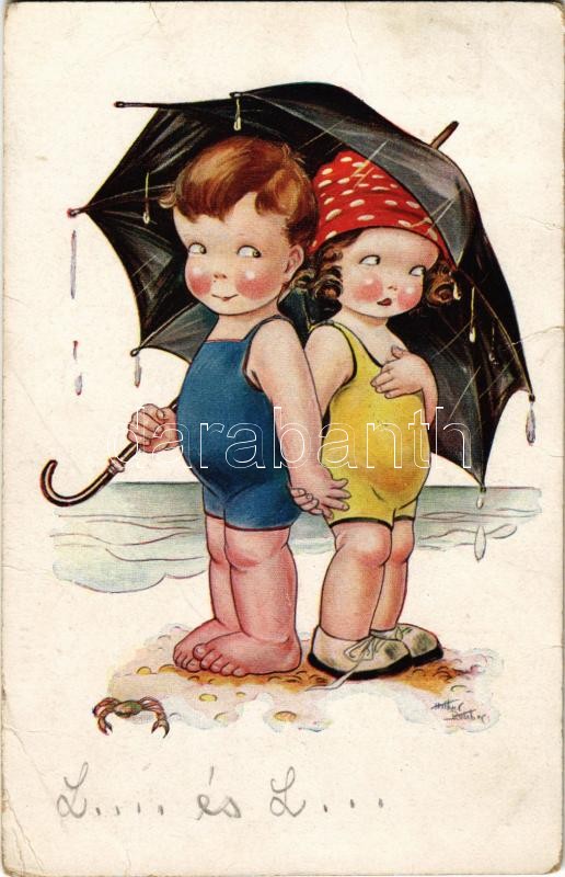 Children art postcard, romantic couple, beach. A.R. & Co. I. B. 15... https://www.darabanth.com/hu/415-Gyorsarveres/415.0/Kepeslapok/Gyerek~1000059/Children-art-postcard-romantic-couple-beach-AR-Co-I-B-1541-1-EB~II2597220