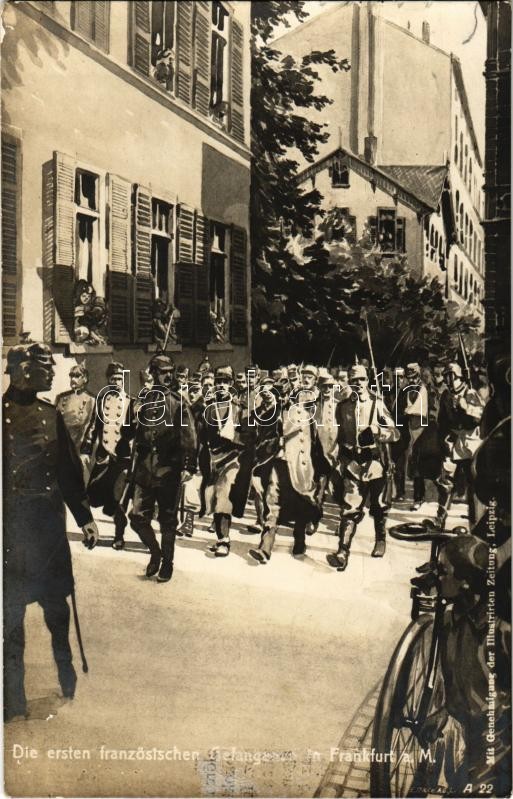 1915 Die ersten französischen Gefangenen in Frankfurt / WWI German military art postcard, French POWs (prisoners of war) in Frankfurt + "K.u.K. Landes-Gendarmerie-Commando Nr. 7. Commando des Detachements im See-Arsenale zu Pola"