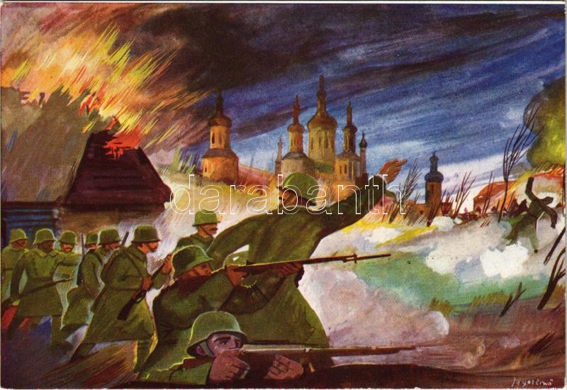 Birta Pál árkászszakasz-anyagkezelÅ‘ tisztes utcai harcban járórével két ellenséges csoportot semmisÃtett meg / WWII Hungarian military art postcard s: Jeges ErnÅ‘ + "HaditudósÃtó KiállÃtás a Pesti Vigadóban május 2-20-ig 1943 V. 16." So. Stpl.