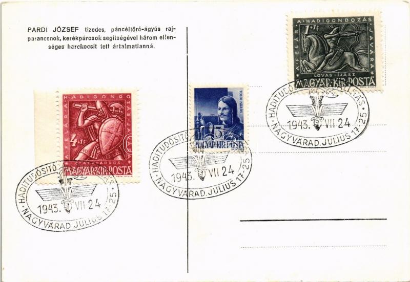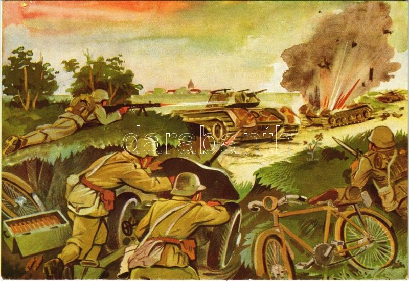 Sasvári Mihály tűzmester járőrével erős szovjet különítményen ütött rajta s tehergépkocsikat, löveget és mozgókonyhát zsákmányolt / WWII Hungarian military art postcard s: Juszkó + "Haditudósító Kiállítás a Pesti Vigadóban 1943" So. Stpl. (kis szakadás / small tear)