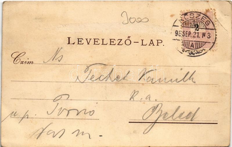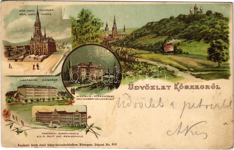 1898 (Vorläufer) Kőszeg, Római katolikus templom, Laktanya, K.u.K. katonai alreáliskola, hidegvíz-gyógyintézet. Róth Jenő kiadása. Art Nouveau, floral, litho (EB)