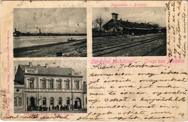 Leírás: 1901 Mohács, Pályaudvar, vasútállomás, Központi szálloda. Weiser Miksa kiadása (r)