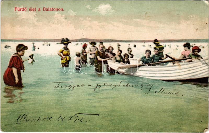 1912 Balaton, fürdőélet, csónak. Divald Károly 2120-1909. https://www.darabanth.com/hu/415-Gyorsarveres/415.0/Kepeslapok/Magyarorszag~1000005/1912-Balaton-furdoelet-csonak-Divald-Karoly-2120-1909~II2601617